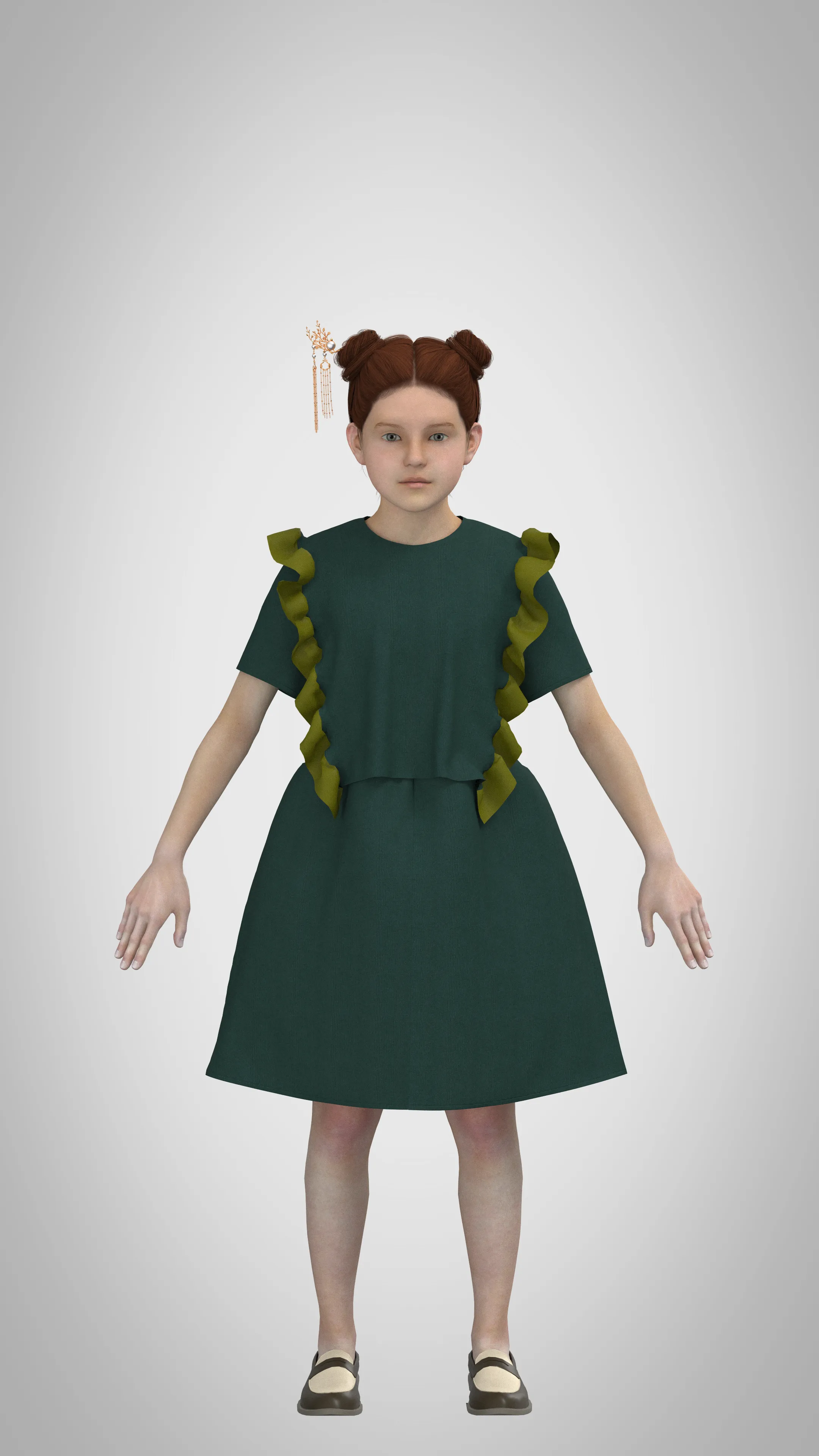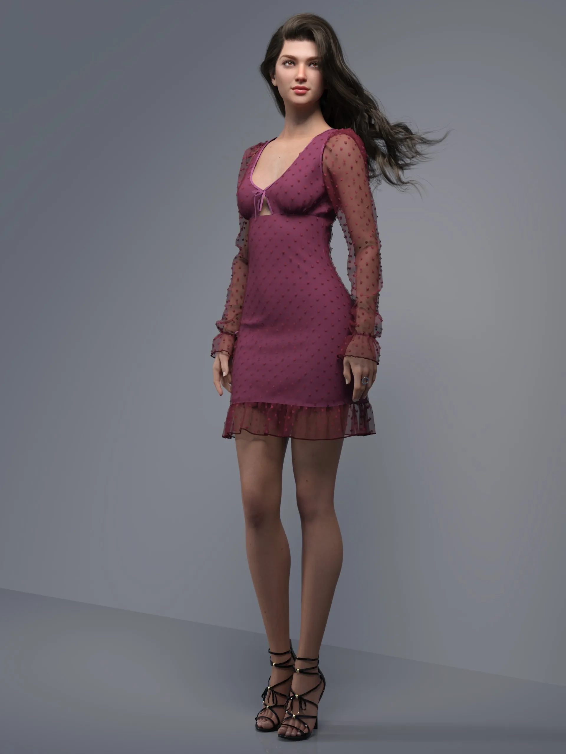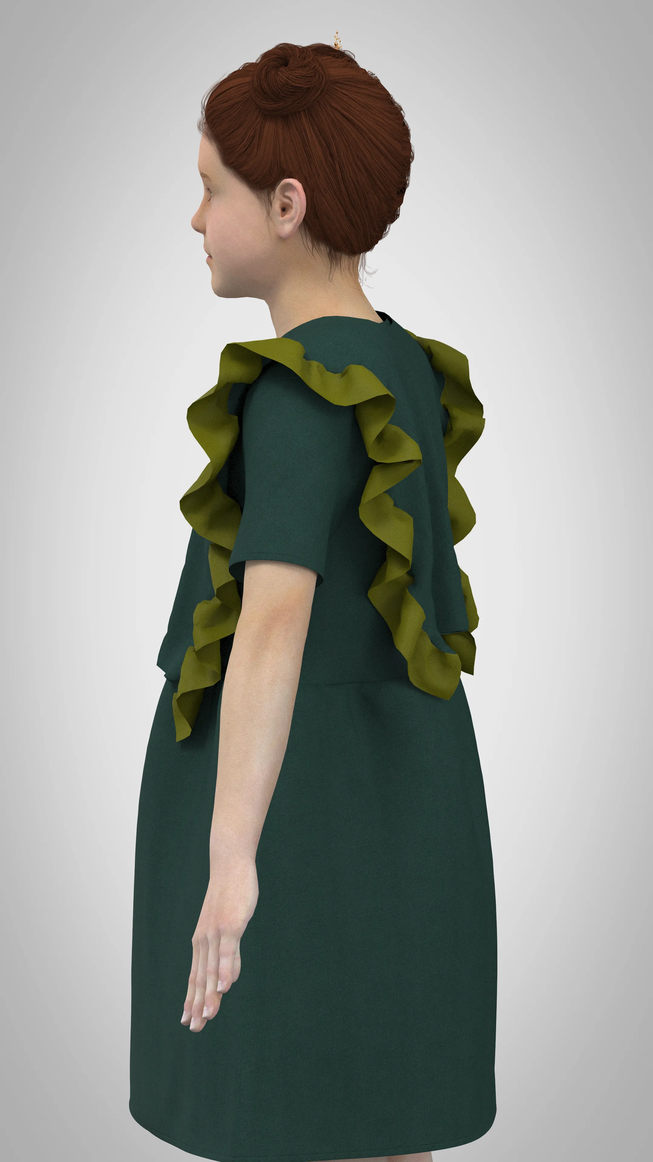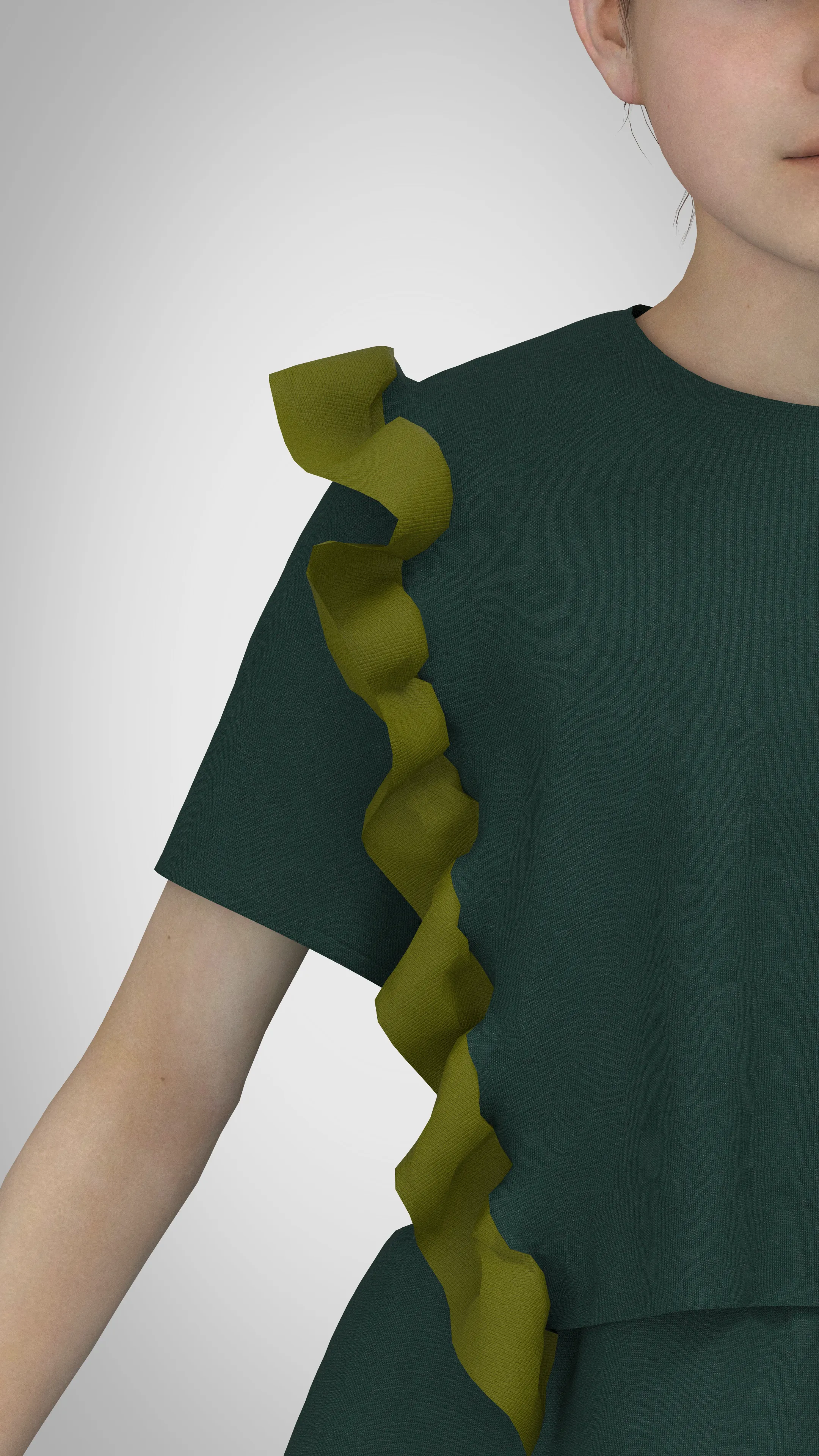 Gaun pendek yang memiliki siluet A-line yang nyaman, dilengkapi dengan ruffle di kedua sisi, menciptakan aksen dinamis dan menyenangkan.