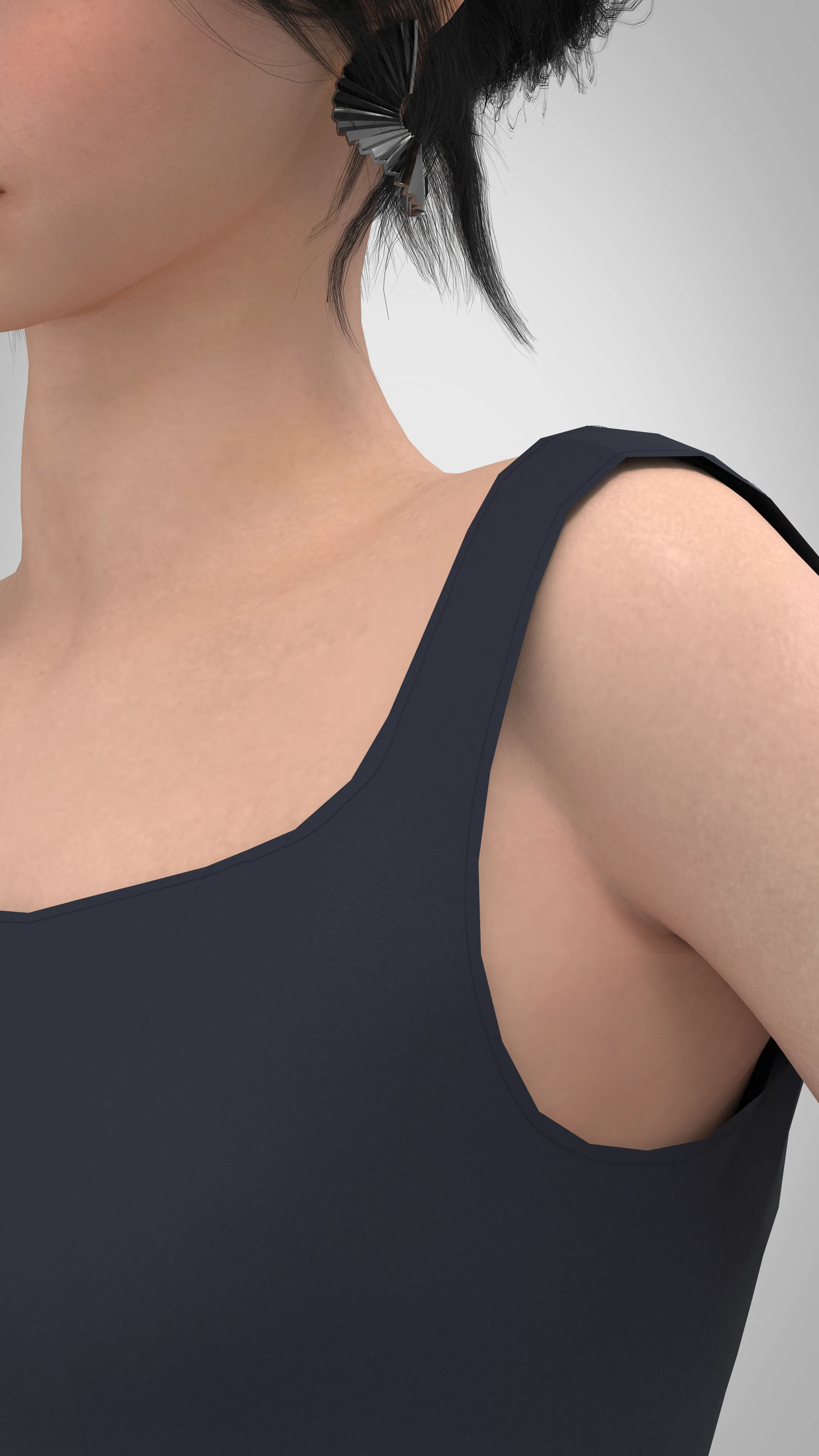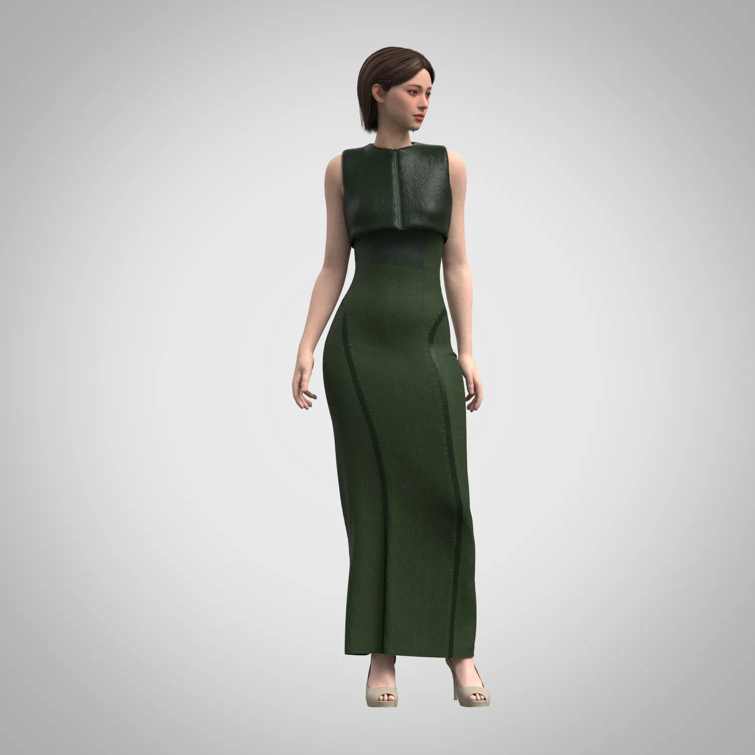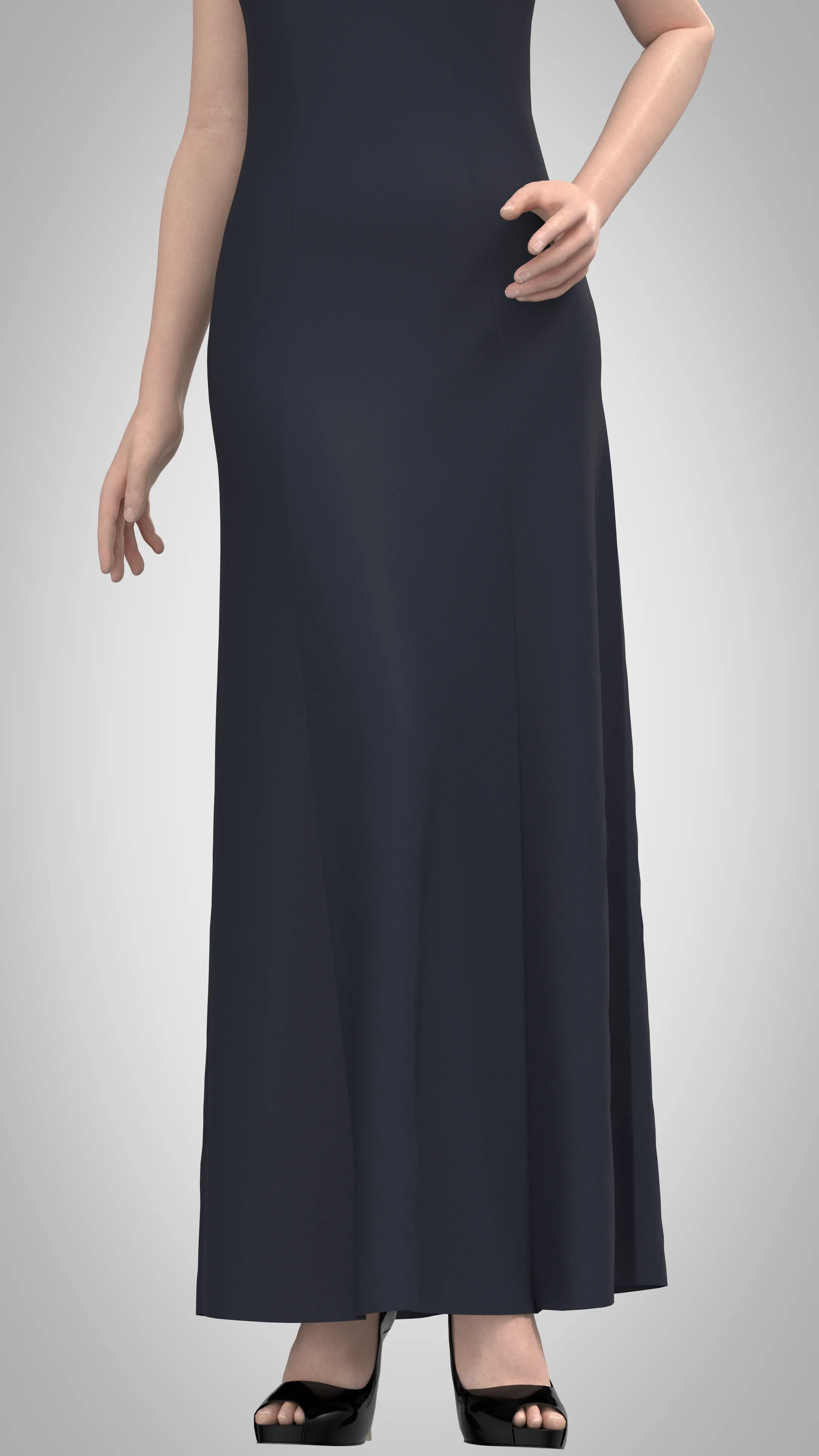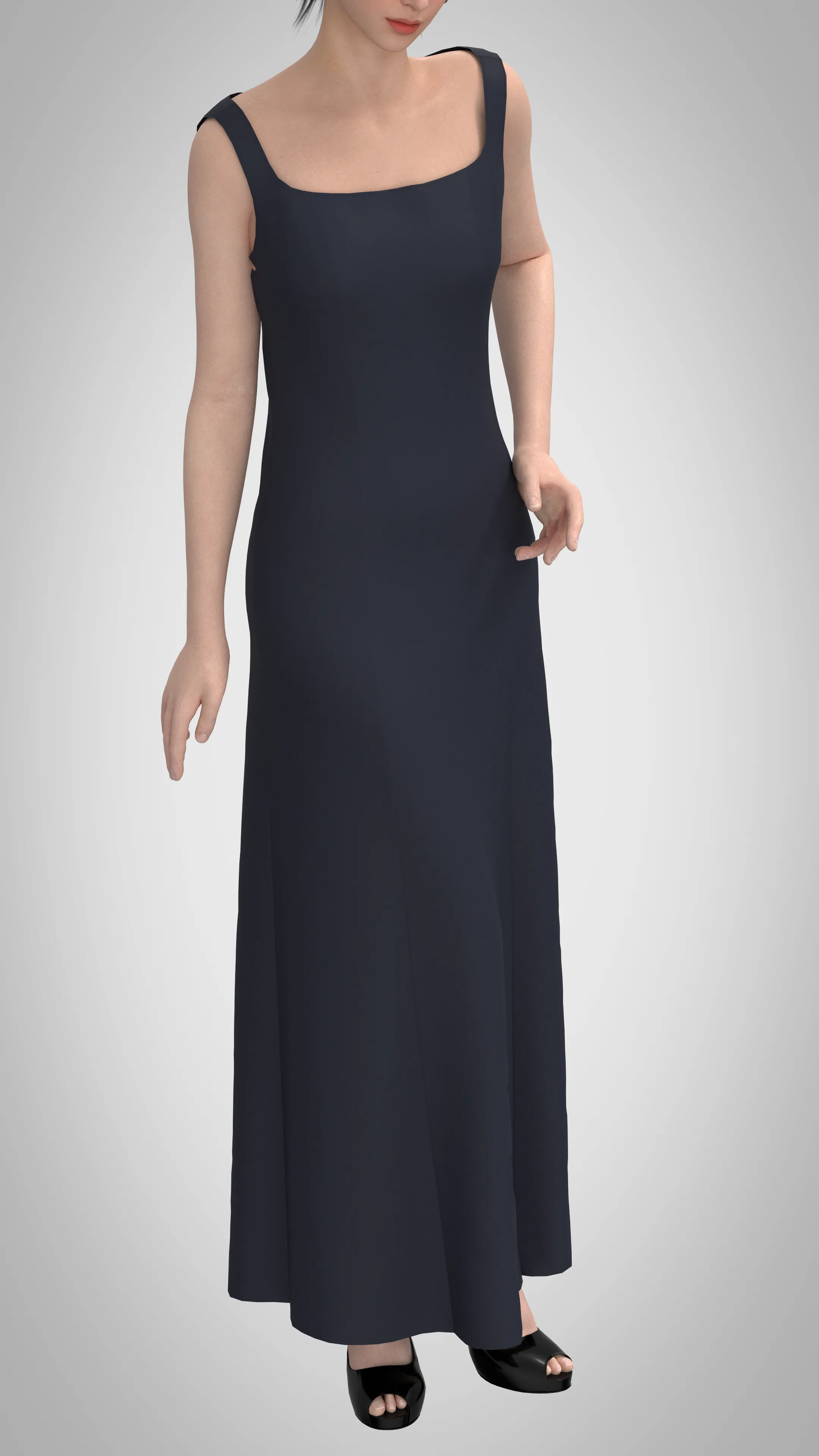 Gaun panjang tanpa lengan berwarna gelap dengan desain sederhana dan elegan. Potongan leher persegi memberikan kesan klasik untuk tampilan formal atau semi-formal.