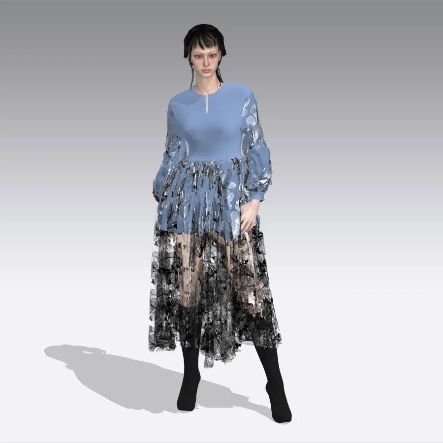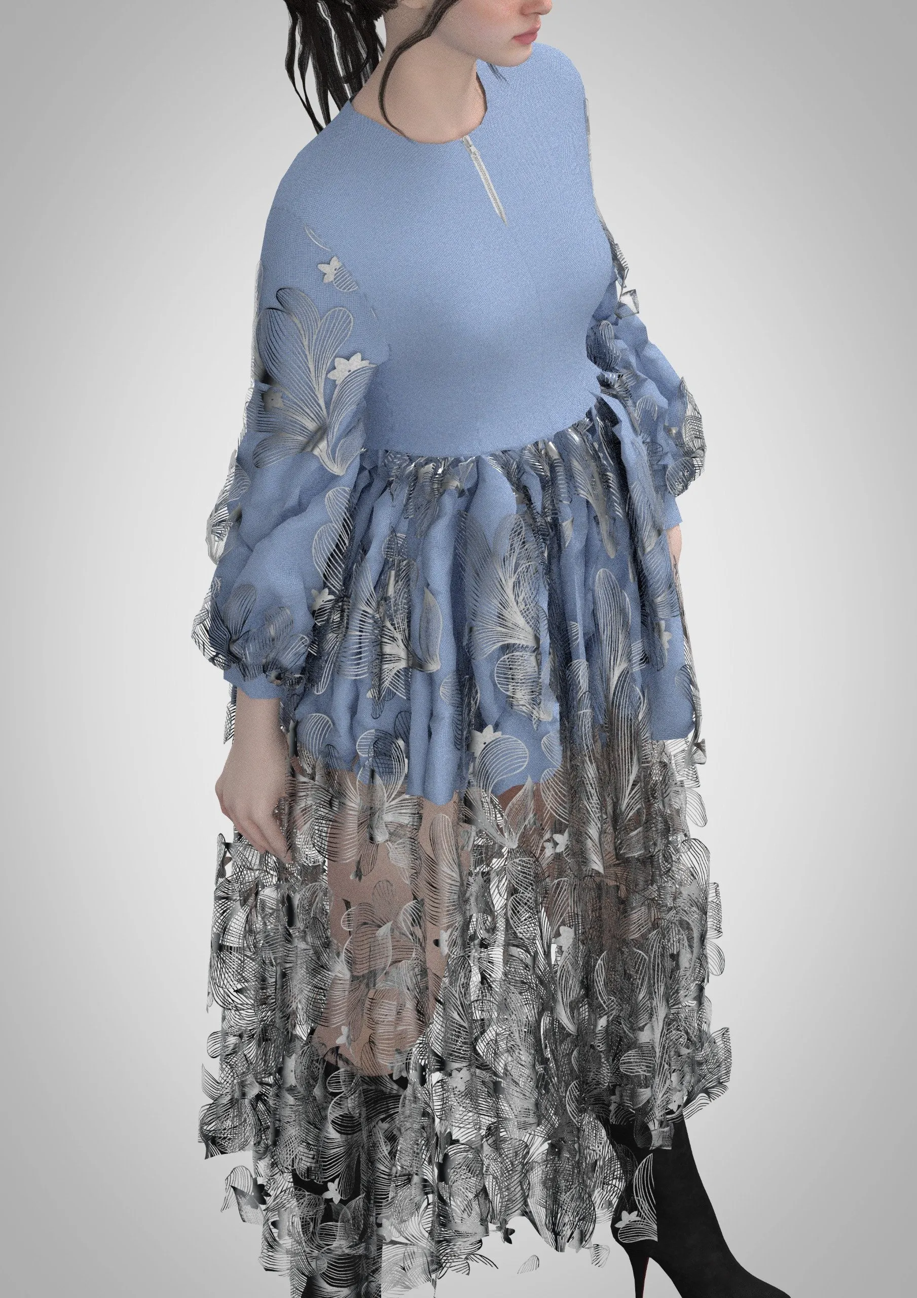 Dres berpotongan longgar dengan detail rok bertingkat, lengan panjang balon, dan warna netral, menciptakan tampilan anggun dan sederhana.