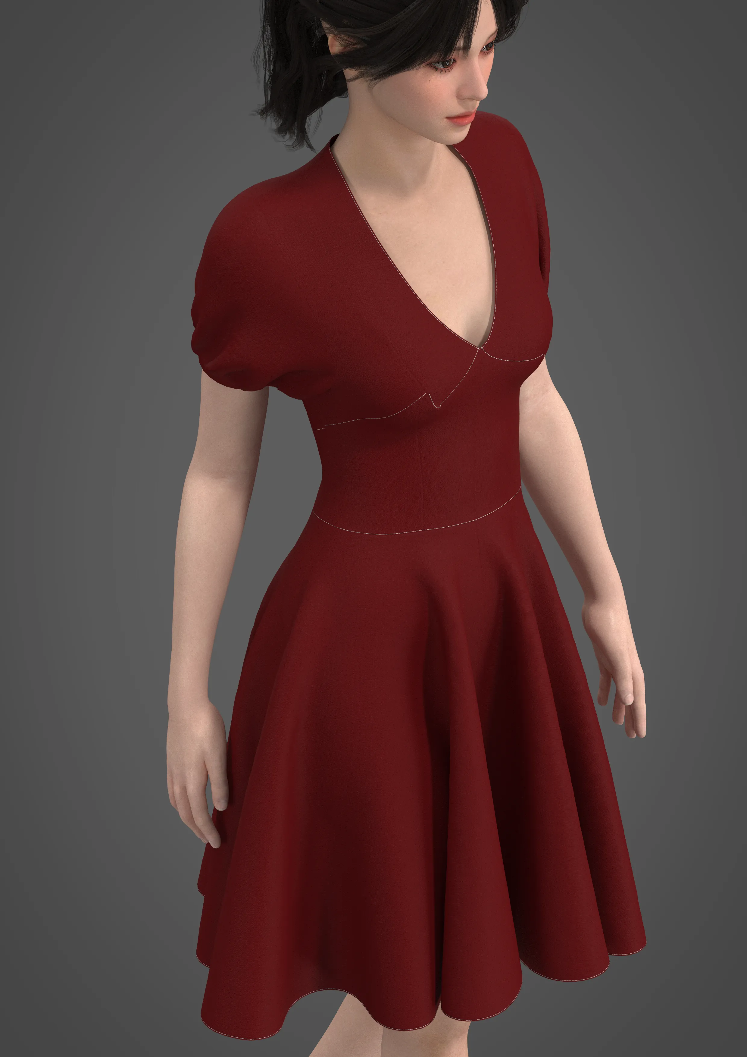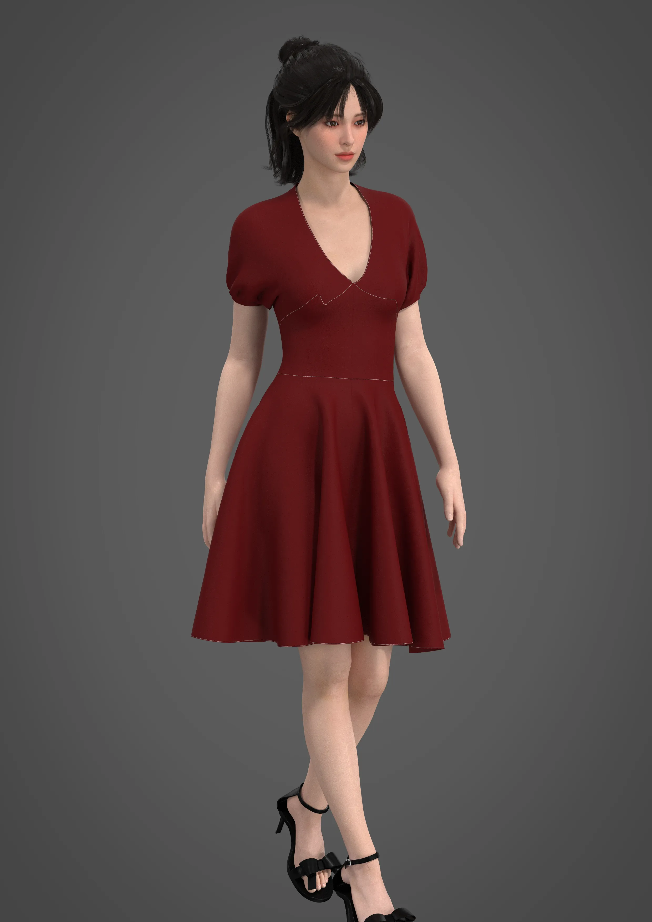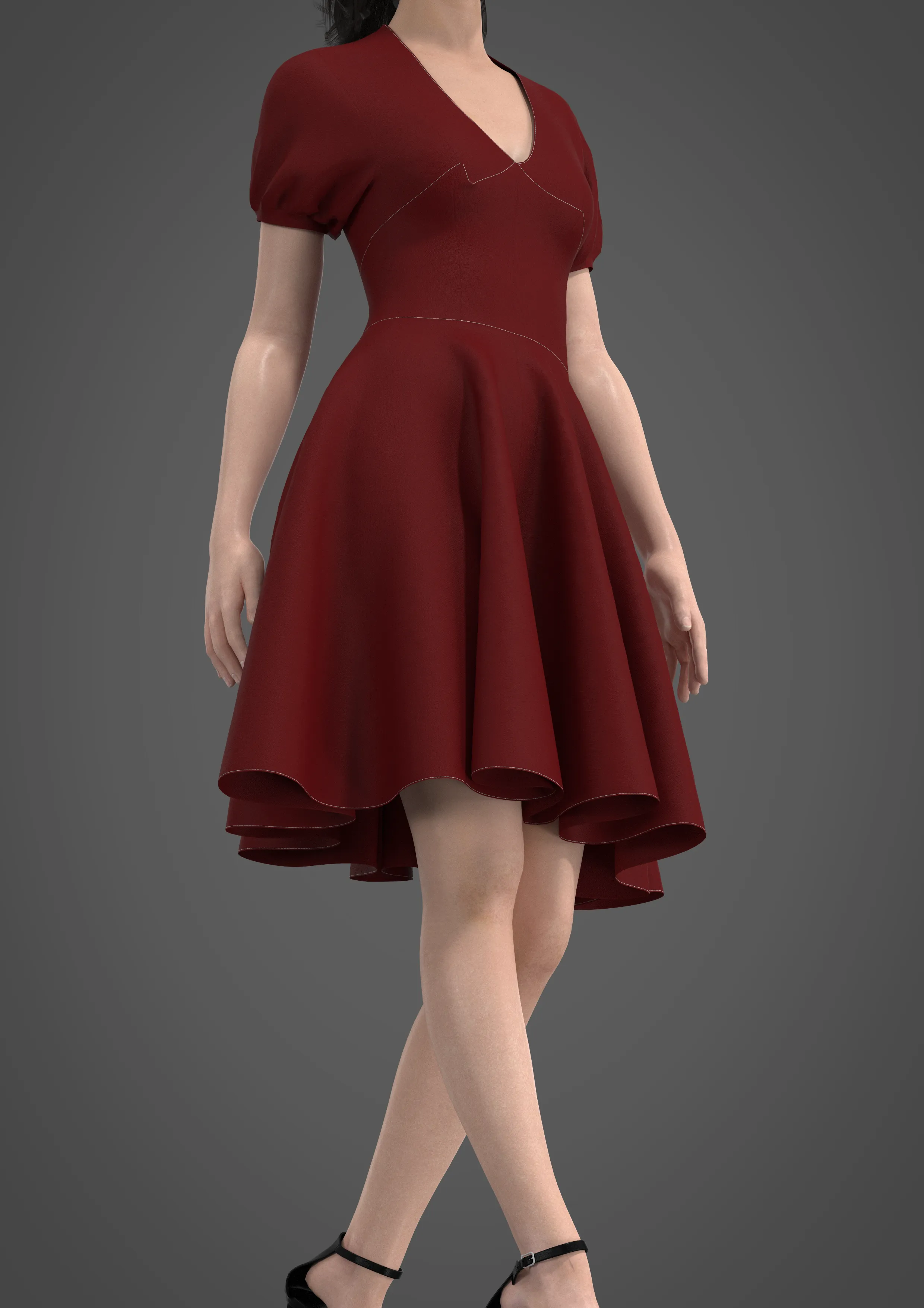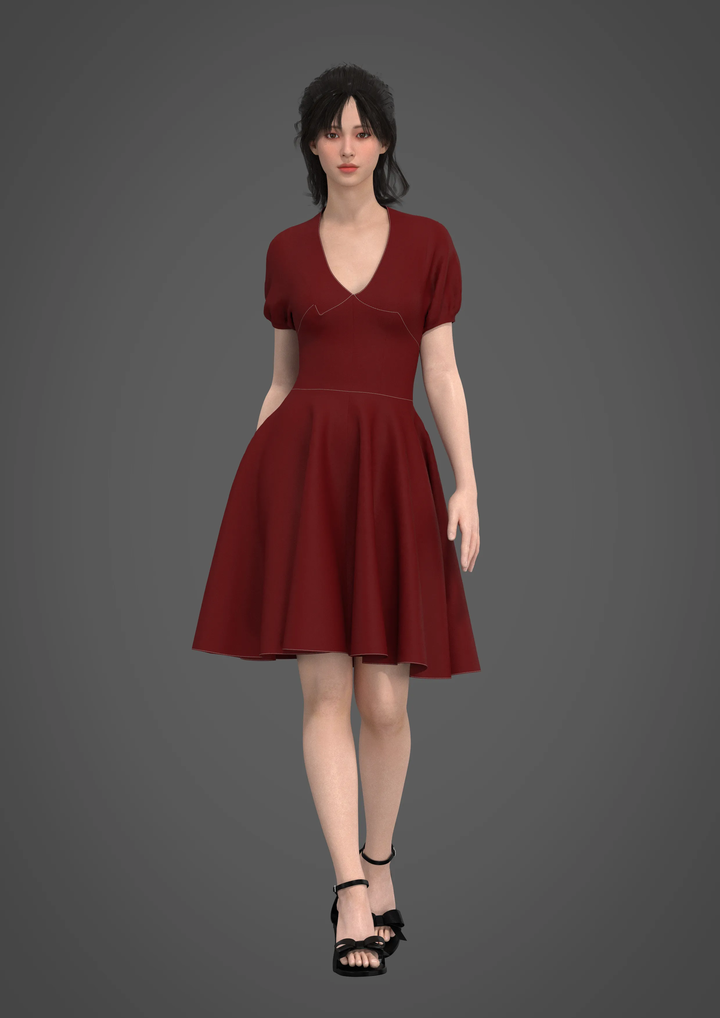Dress ini berwarna maroon dengan desain V-neck, lengan pendek puff, dan potongan fitted di pinggang. Roknya berbentuk flare, jatuh di atas lutut, memberikan kesan feminin dan anggun. Cocok untuk acara semi-formal dengan sentuhan elegan.