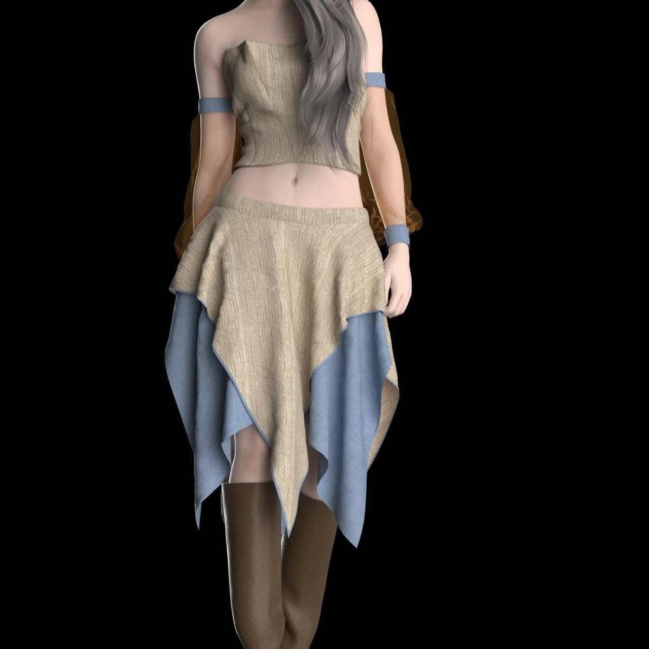 Atasan tanpa lengan berbahan denim dengan potongan leher persegi dilengkapi detail ruffle di bagian bahu dan pinggang, dipadukan dengan rok mini berpotongan asimetris berbahan santorini hitam.