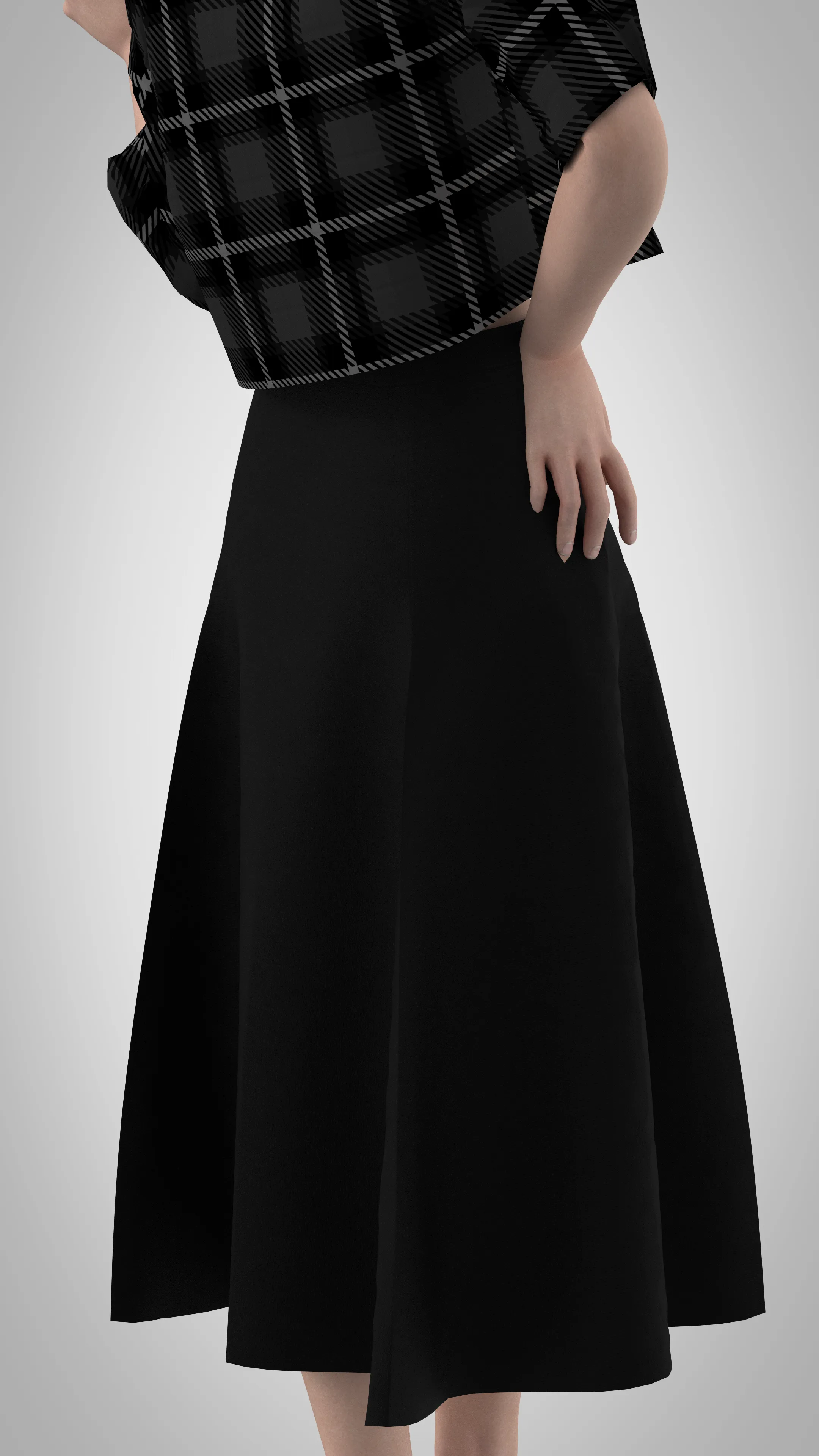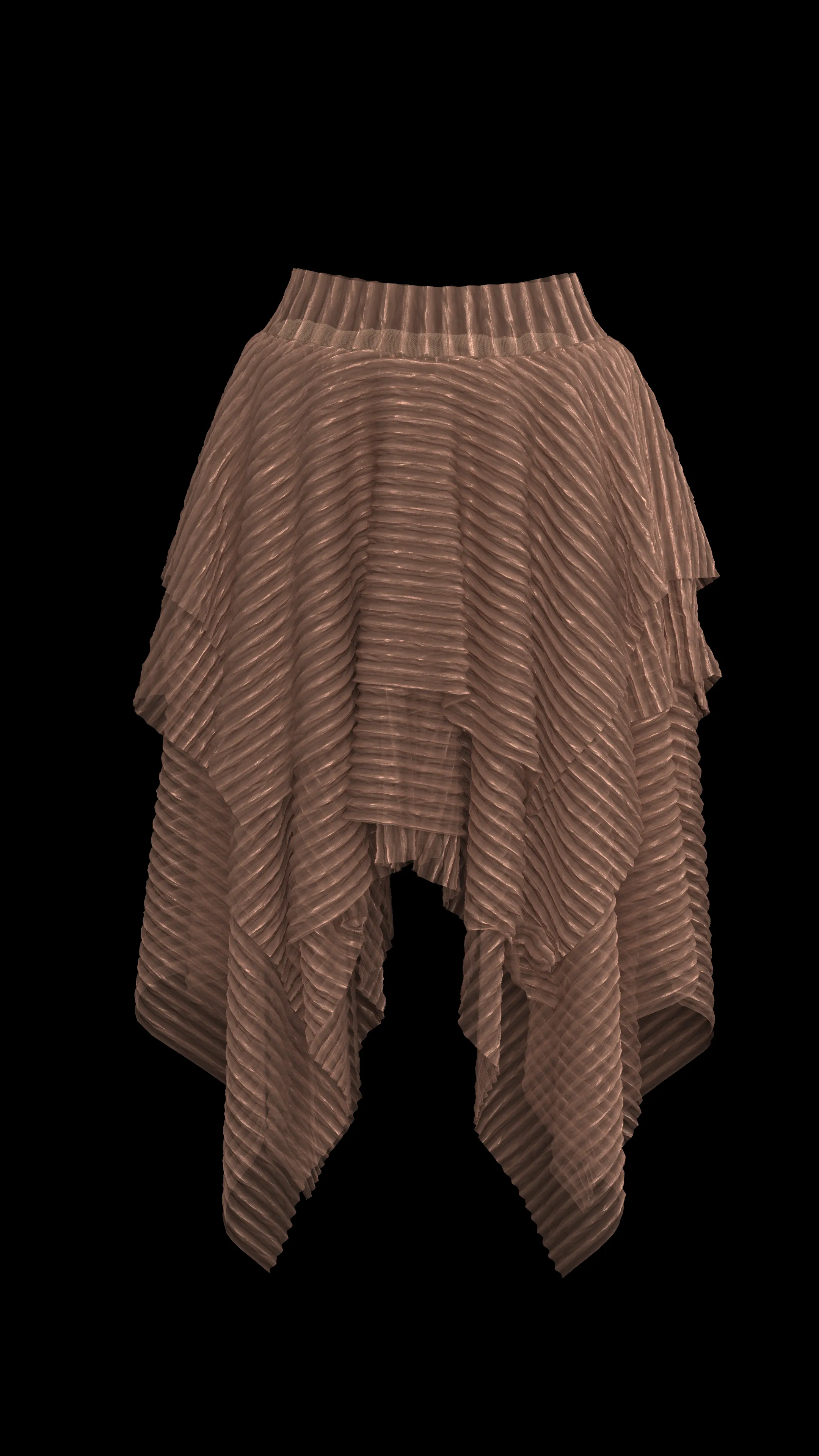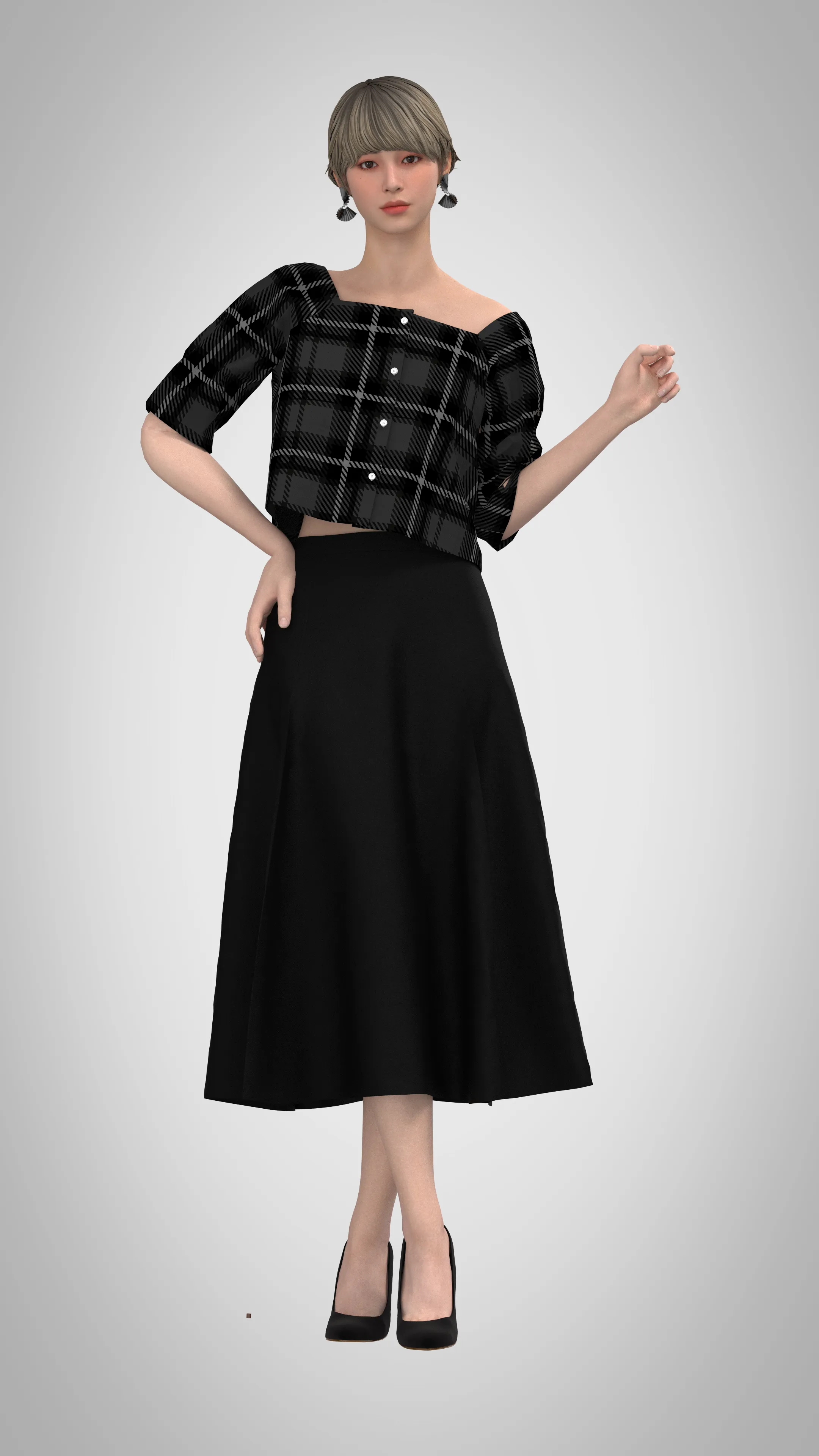 Rok A-Line pendek yang dilengkapi dengan lapisan rok persegi bertumpuk, menciptakan kesan volume yang dinamis dan berkarakter. Desain ini memberikan kesan feminin dan edgy.