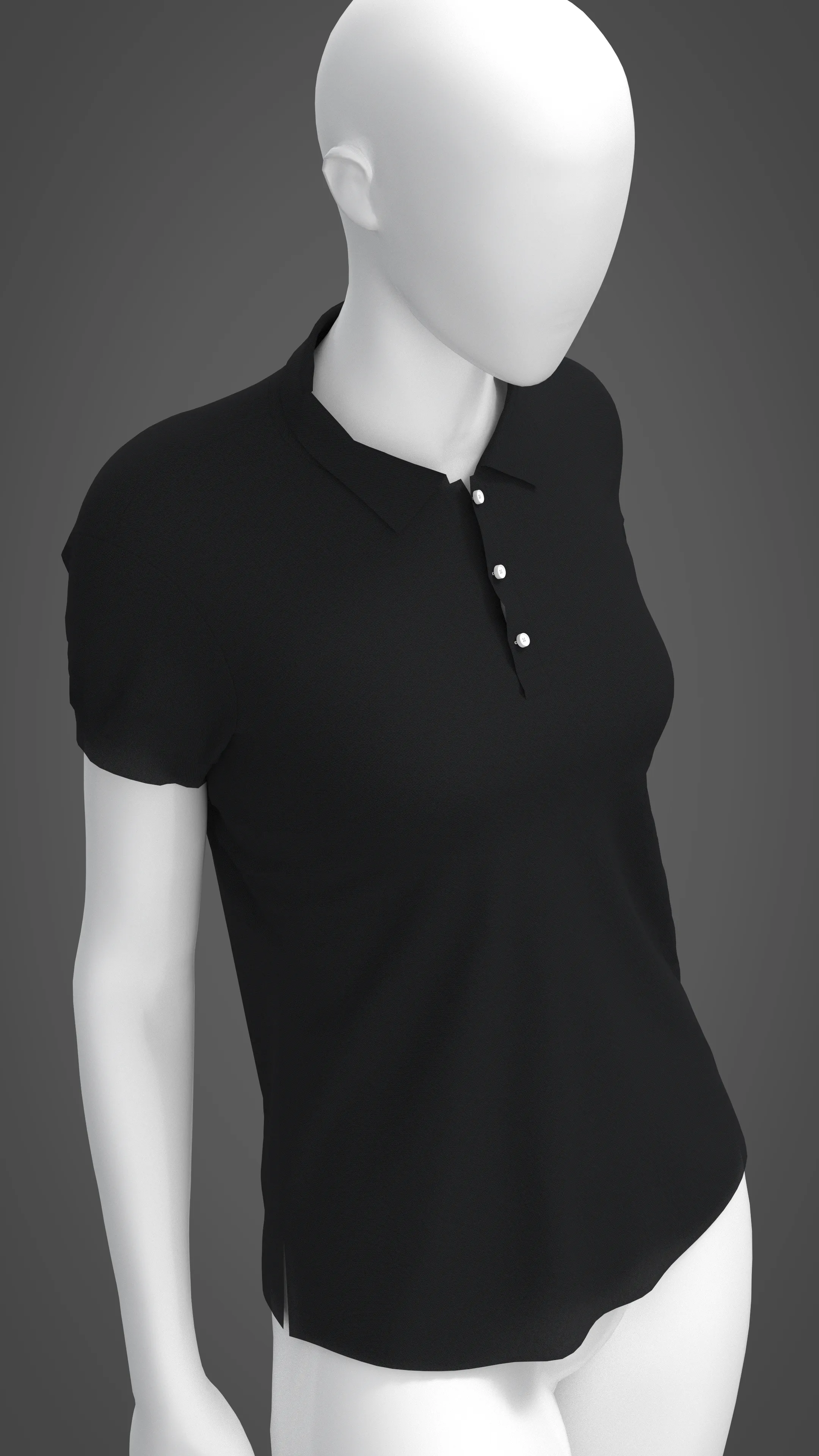 Polo T-shirt hitam klasik dengan lengan pendek, kerah standar, tiga kancing, tekstur kain halus (piqué), fit regular, dan hem melengkung untuk tampilan rapi dan santai.
