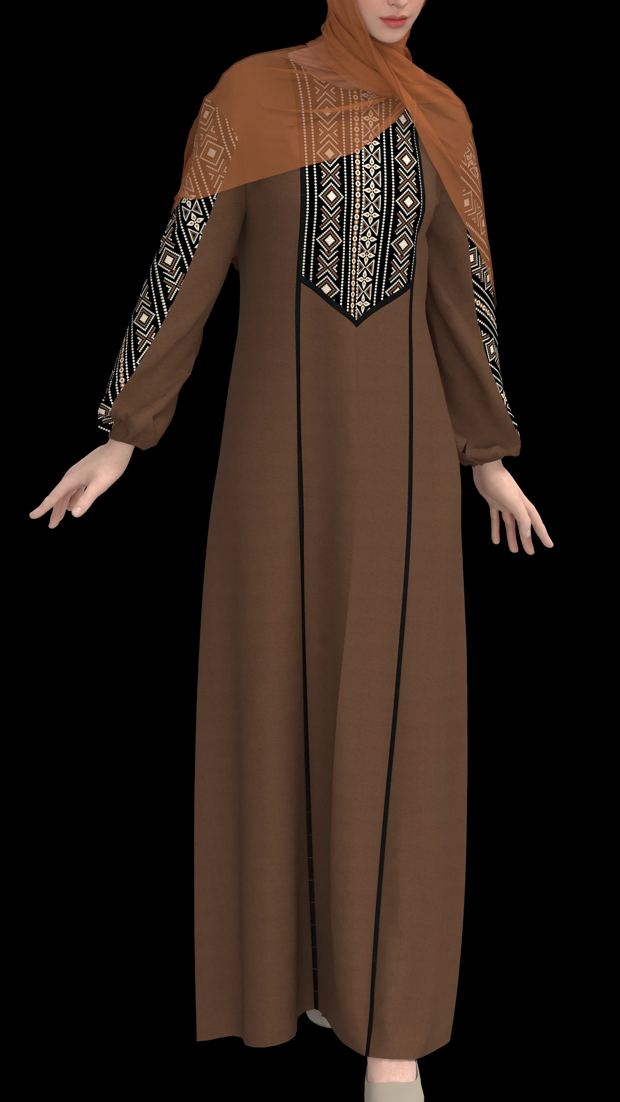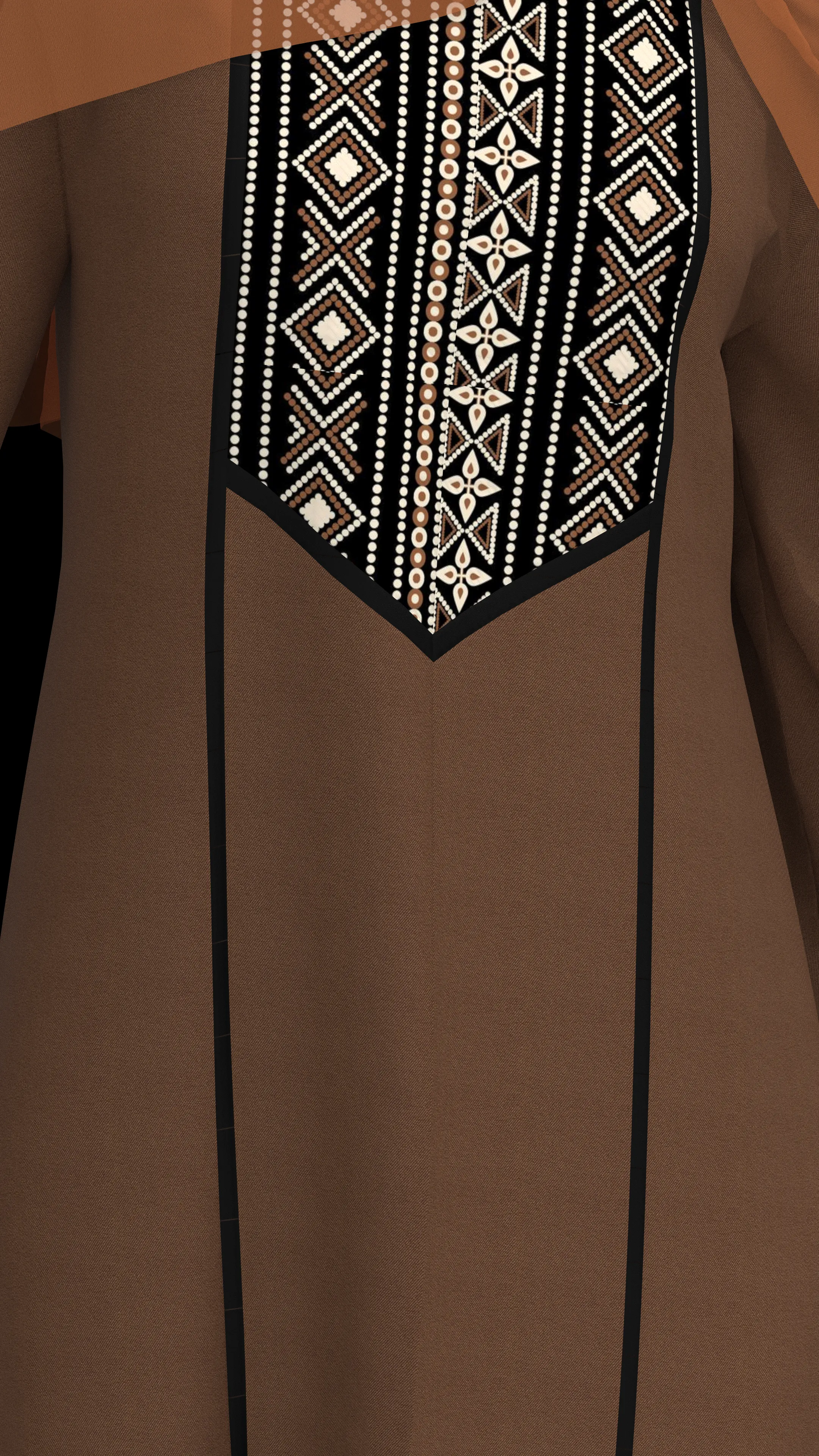 Gamis modern warna cokelat dengan pola etnik pada dada, lengan, dilengkapi garis hitam vertikal, lengan panjang elastis. Tampilan elegan dan etnik, cocok untuk acara formal.