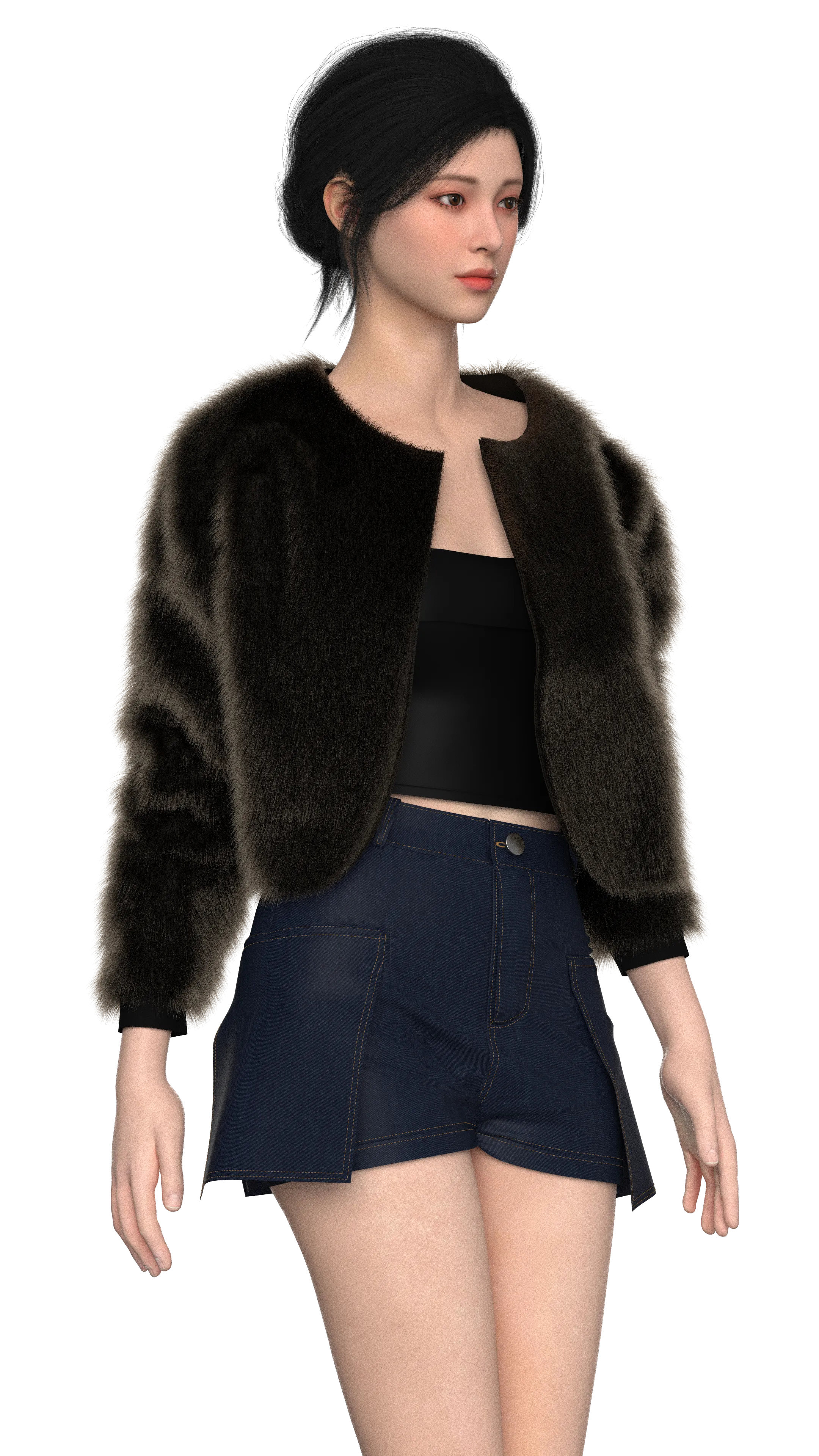 Cardigan ini berbahan bulu sintetis berwarna gelap, berlengan panjang, dengan potongan sederhana tanpa kancing di bagian depan, cocok untuk gaya kasual atau semi-formal.