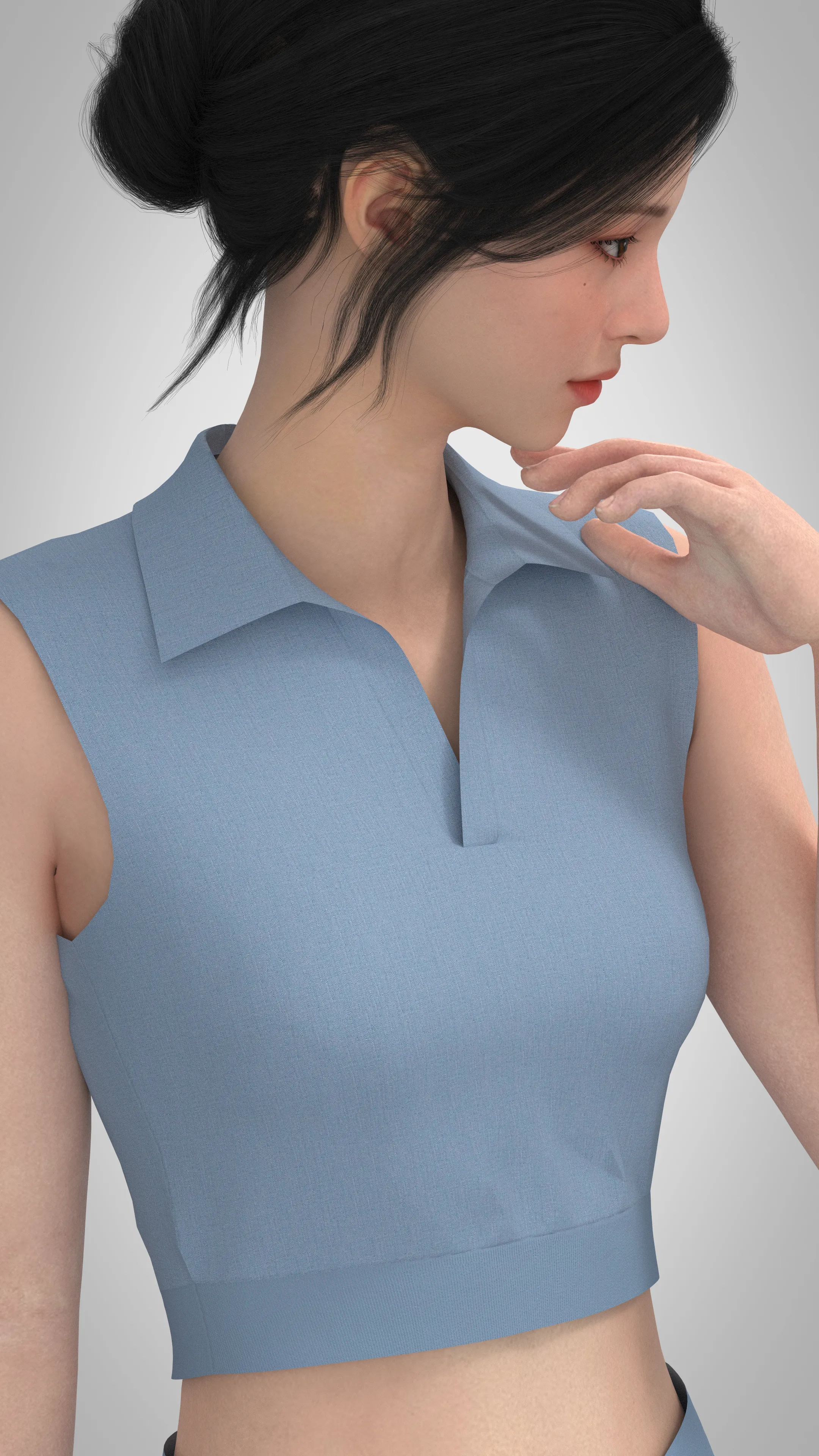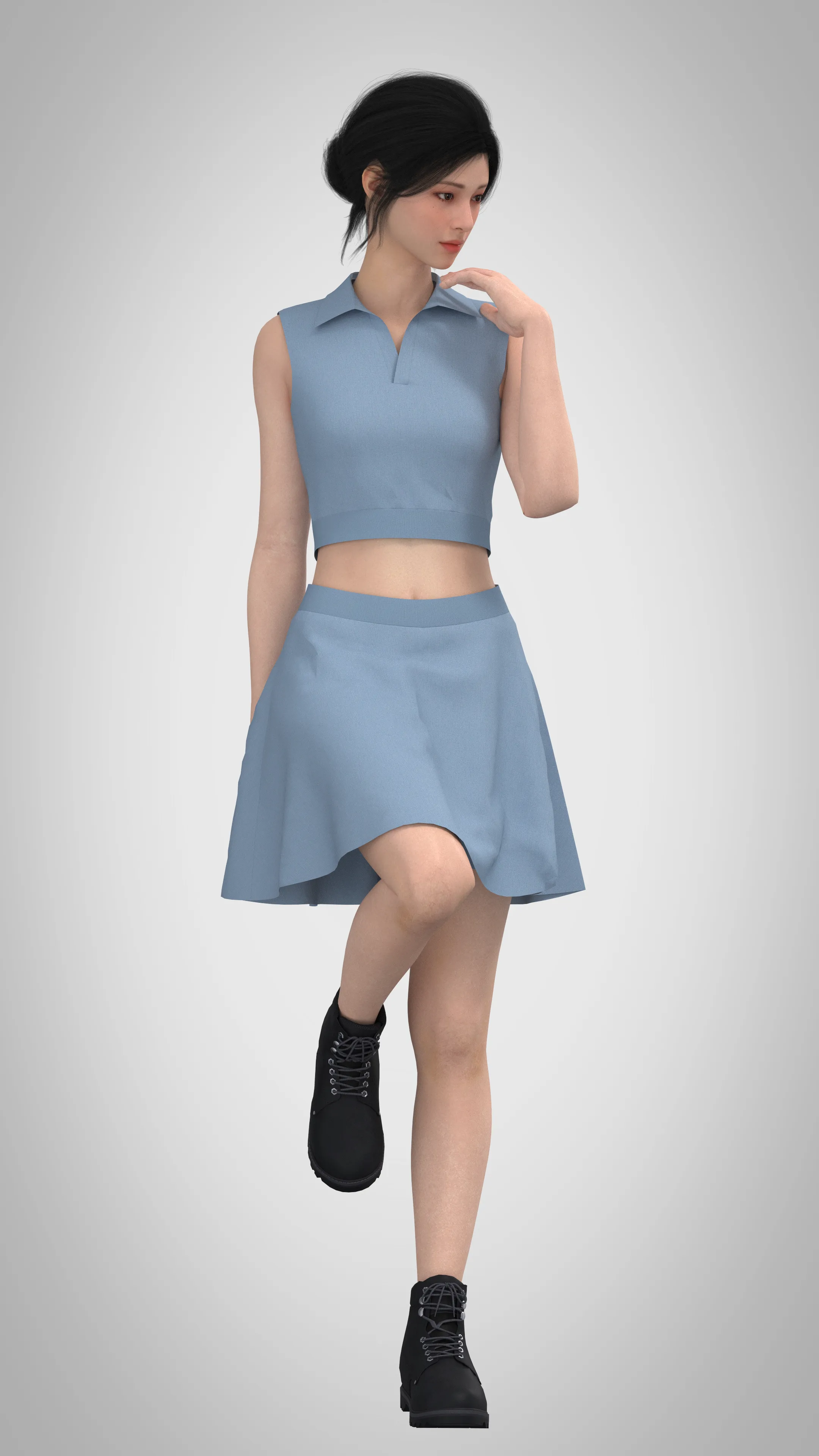 Setelan ini terdiri dari atasan tanpa lengan berkerah dengan ritsleting pendek di bagian depan, dipadukan dengan rok flare mini berbahan ringan. Cocok untuk gaya santai atau semi-formal.