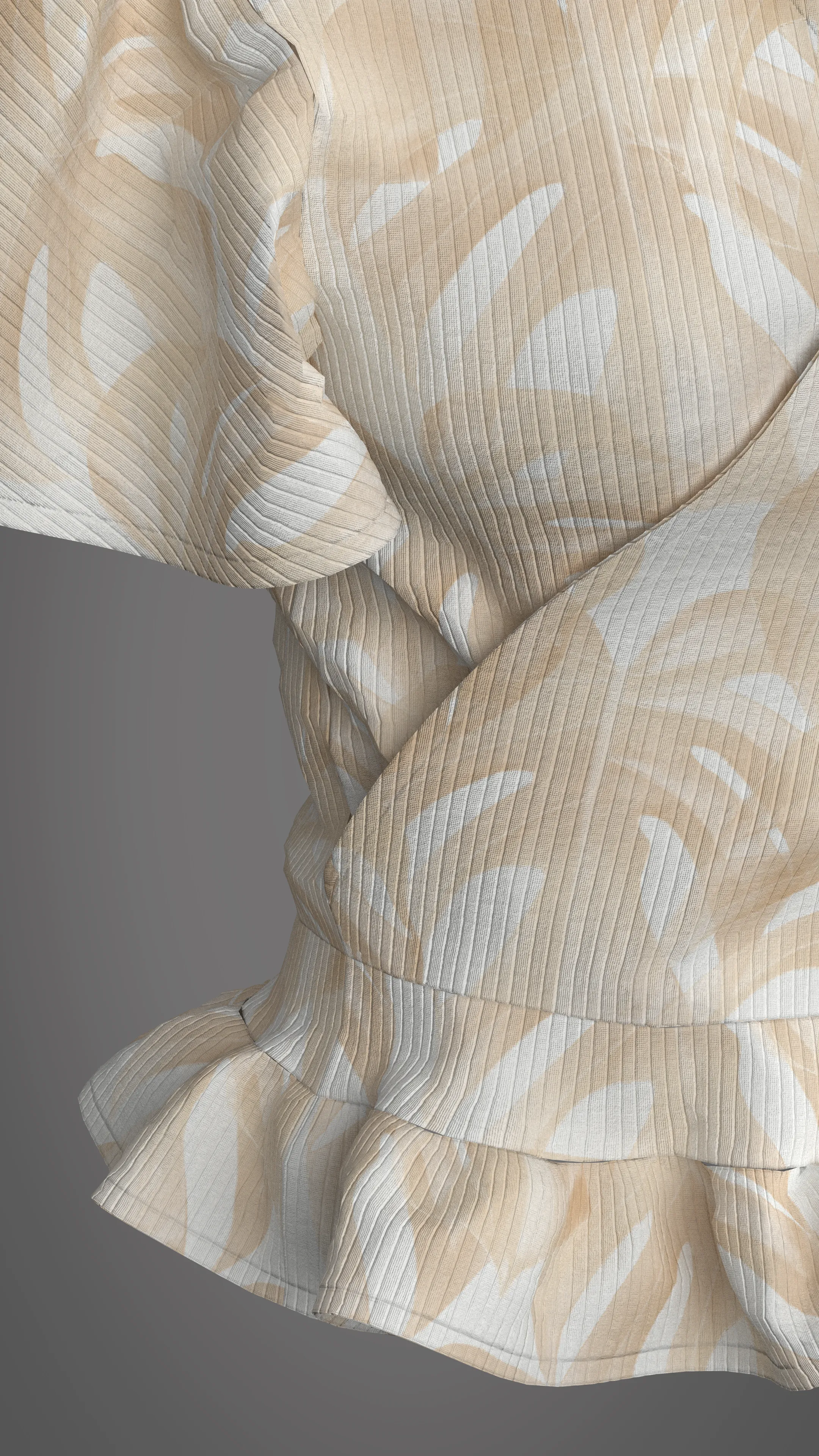 Atasan V-Neck dengan lengan pendek mengembang dan ditambah aksen ruffle pada bagian bawah memberikan kesan feminim dan manis.