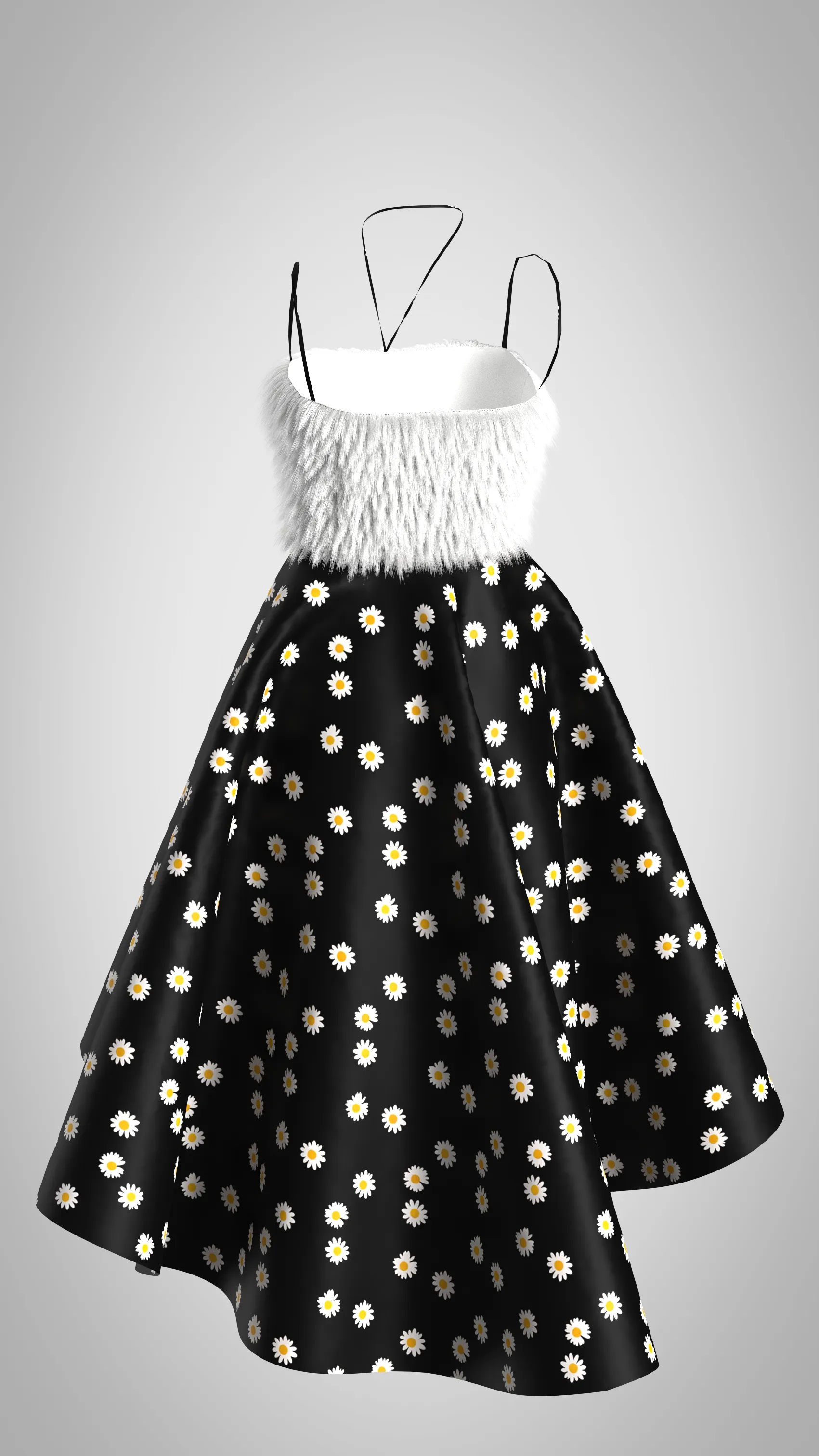 dress yang dilapisi bahan bulu putih yang lembut dengan strap tipis yang minimalis dan dipadukan dengan rok lingkar dengan motif bunga daisy.